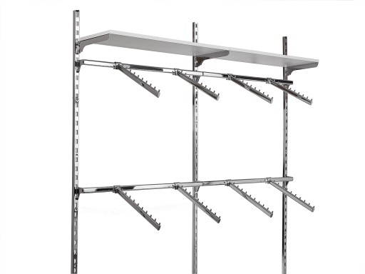 Opis: Garderoba dwumodułowa to funkcjonalny mebel do zastosowania w domowej garderobie. Nowoczesna konstrukcja oparta na systemie profili ściennych. Rozmieszczenie wieszaków na szynach można dowolnie konfigurować. Ogromną zaletą tego systemu jest jego uniwersalność, wyposażenie można wymieniać na inne elementy (półki, wieszaki itp) w zależności od pojawiających się potrzeb. Szyny przymocowane do ściany stanowią solidną podstawę dla wieszaków. Mebel łatwy w montażu. Można powiększać o kolejne moduły.