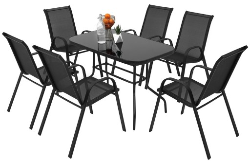 ZESTAW MEBLI OGRODOWYCH idealny do Twojego ogrodu. Stelaż został podwójnie lakierowany proszkowo, co idealnie przystosowuje ten produkt to zastosowania wewnątrz jak i na zewnątrz. Siedzisko krzesła oraz oparcie zostało zrobione z czarnego, elastycznego obicia tekstylnego tak, aby maksymalnie zwiększyć wygodę. Posiada ono dwa oparcia boczne. Użyte materiały nie wymagają częstej konserwacji, są odporne na warunki pogodowe i nie wymagają specjalnych środków do pielęgnacji. Nóżki są dodatkowo zaopatrzone w nakładki z tworzywa sztucznego.Stół posiada blat z czarnej hartowanej szyby o gr. 5 mm.