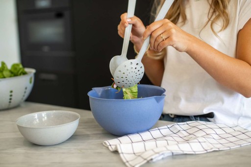 Łyżki do serwowania sałaty Palsby Organic to doskonale uzupełniający się zestaw – jedna jest pełna, druga – cedzakowa.