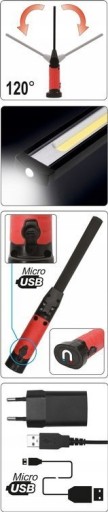 Funkcjonalna lampa warsztatowa 5W z umieszczoną na górze latarką o mocy 3W. Strumień świetlny 600 lumenów oraz 3 tryby świecenia gwarantują wydajną i komfortową pracę. Magnes na spodzie umożliwia zamocowanie lampy do elementów metalowych. Długa, cienka i regulowana górna część lampy ułatwi oświecenie trudno dostępnych miejsc.