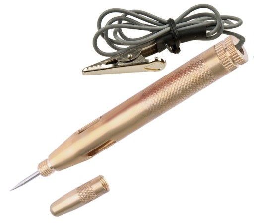 Samochodowy próbnik napięcia prądu w zakresie 6-24V. Próbnik ma metalową obudowę, która jest odporna na uszkodzenia mechaniczne.
