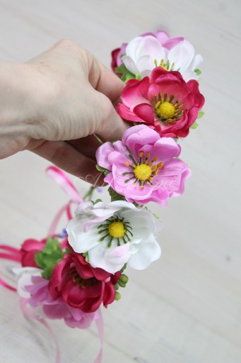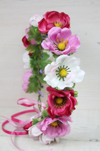 Stylowy, delikatny i niepowtarzalny wianek krakowski, pełen kolorowych satynowych kwiatów maków w odcieniach różu, fuksji i kremu, zdobiony satynowymi tasiemkami.