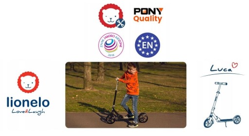 Wysoką jakość , niezawodność i bezpieczeństwo hulajnogi Lionelo Luca potwierdza przyznany certyfikat PONY . Hulajnoga spełnia dyrektywy normy EN . Dodatkowo produkt objęty jest pakietem Lionelo Assistance