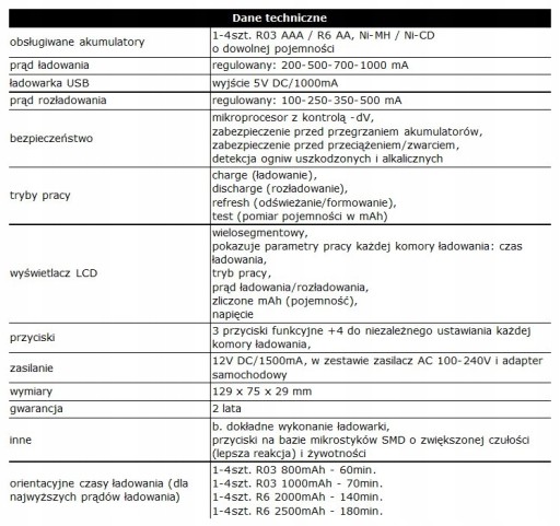 - min. czas ładowania 4 akumulatorów 2500mAh - 3h.