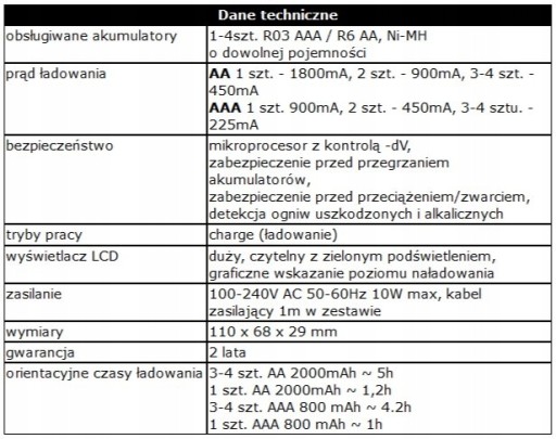 - czytelny wyświetlacz LCD z zielonym podświetleniem. - ochrona akumulatorów przed przeładowaniem,