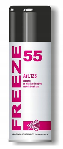 Freeze 55 to chemicznie czysty nietoksyczny preparat chłodzący do wyszukiwania usterek metodą termiczną, powoduje schłodzenie pokrywanych miejsc do temperatury 55°C.