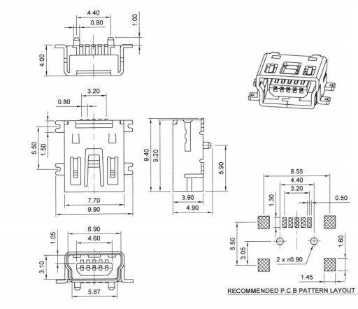 РАЗЪЕМ USB В СБОРЕ SMD ТИПА MINI B, 5-КОНТАКТНЫЙ FV