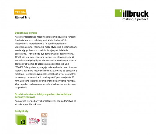 TP650 illmod Trio jest wielofunkcyjną, impregnowaną taśmą rozprężną, zaprojektowaną do wszechstronnego uszczelniania połączeń budowlanych. Przeznaczona jest szczegolnie do uszczelniania ruchomych złączy, np.