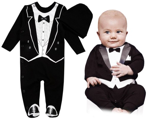 Kombinezon - pajac jednoczęściowy, rozpinany na całej długości, od ramienia do pięty. Nadruk na ubranku przedstawia elegancki frak z białą koszula i muszką, na stópkach nadruk bucików.