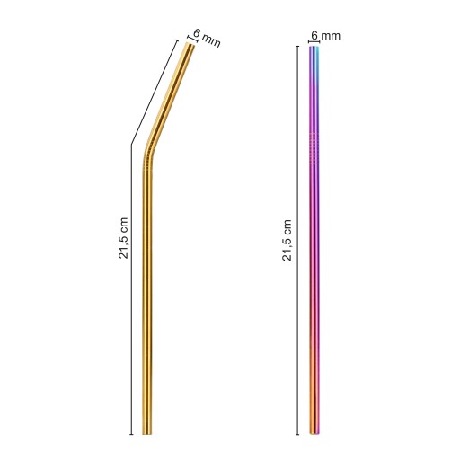 Zestaw słomek do napojów THINK-GREEN jest wykonany z wysokiej jakości stali nierdzewnej 304, która rekomendowana jest, jako materiał do kontaktu z żywnością. Długość 215 mm i średnica 6 mm są dobrane w taki sposób, aby korzystanie z nich było bardzo przyjemne i stanowiło wartość dodana do Twoich wspaniałych napojów. Różne kolory słomek dają Ci możliwość doboru słomki do charakteru drinka.