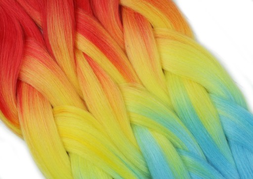 Włosy syntetyczne w przepięknym wariancie kolorystycznym -czerwono-żółto-niebiesko-fioletowym. Wykonane z gładkiego i przyjemnego w dotyku henlonu.