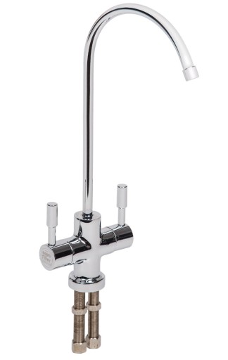 Podwójna, nowoczesna, chromowana wylewka z zaworami ceramicznymi do filtrów odwróconej osmozy oraz do filtrów pod zlewozmywakowych.