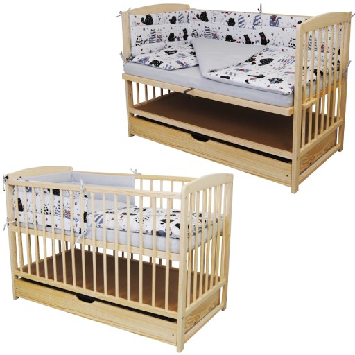Do łóżeczka polecamy pościele, funkcje dostawki oraz kółka widoczne na poniższych zdjęciach. Łóżeczko dostępne również w wersji z szufladą i kolorze naturalna sosna.