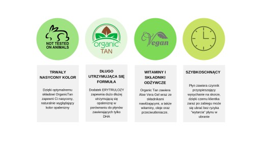 Organic Tan to najwyższej jakości produkt do opalania opracowany przy użyciu najnowszej technologii zapewniający głęboki, nasycony kolor i naturalnie wyglądającą opaleniznę. Zawiera mieszankę dihydroksyacetonu i erytrulozy w optymalnych proporcjach dzięki których opalenizna utrzymuje się dłużej.
