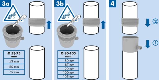 Zbieracz można zastosować do rur spustowych PCV i metalowych o średnicy : 80 mm, 87 mm, 90 mm, 100 mm, 105 mm