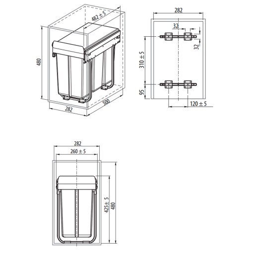 Produkt zawiera: Stelaż do koszy, Komplet prowadnic pełnego wysuwu z cichym domykiem, 3x pojemnik 10 L