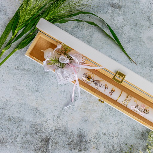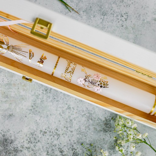 Wyjątkowy zestaw - ręcznie ozdabiana świeca do chrztu z ozdobną wstążką z różowym lub niebieskim akcentem kolorystycznym i drewniane białe pudełko z wygrawerowaną dedykacją pozwolą Ci wręczyć świecę w taki sposób, że nie tylko ona sama będzie prezentem, ale także jej opakowanie.