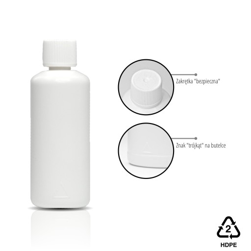 Butelka pod atomizer, nakrętkę bezpieczną (child-proof) lub dowolny dozownik z gwintem 18x3. Cylindryczny korpus butelki dostosowany do atomizera w wielu przypadkach znakomicie zastępuje pojemniki ciśnieniowe. Butelka posiada wytłoczony trójkąt ostrzegawczy, który jest obowiązkowym symbolem w produktach niebezpiecznych. Opakowanie produkowane z twardego polietylenu zapewnia wysoką nieprzenikalność.