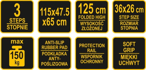 Posiada szerokie, antypoślizgowe stopnie. Miękki uchwyt daje dwojakie korzyści - komfort użytkowania, ponadto przechowując drabinę opartą np. o ścianę nie obijamy jej.
