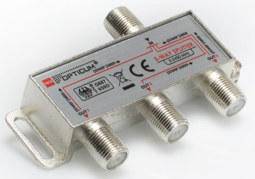 Splitter (rozgałęźnik) sygnału 1/3 posiada 1 wejście i 3 wyjścia, zakres pracy 5-2400 MHz. Umożliwia przejście napięcia DC.