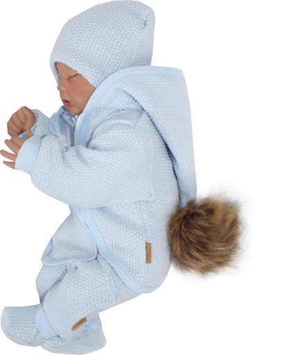 Kurtka, czapka i spodnie z wbudowanymi butkami wykonane z pięknego włóczkowego materiału.