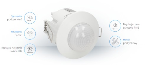 Czujnik przystosowany do montażu w sufitach podwieszanych, służy do sterowania oświetleniem lub innymi urządzeniami elektrycznymi. Potrójny system czujników ruchu z detektorami umieszczonymi pod specjalnym kątem zapewnia kontrolę całego obszaru. Urządzenie nadaje się do zastosowania w dużych pomieszczeniach np. hale magazynowe, poczekalnie. Potencjometry do regulacji: czasu świecenia i czułości natężenia światła. Czujnik współpracuje z oświetleniem LED-owym.