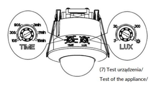 Uwaga: Podczas testowania urządzenia w świetle dziennym, pokrętło LUX należy obrócić na pozycję (SUN), w przeciwnym wypadku czujnik nie będzie działać prawidłowo!