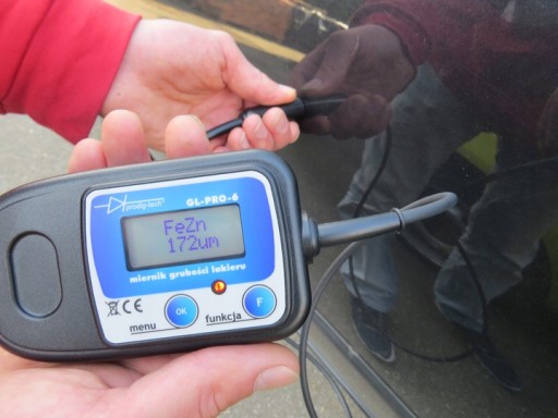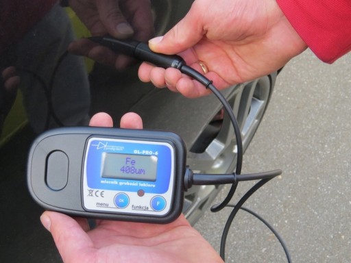 Pomiar grubości lakieru na samochodowych blachach stalowych, stalowych ocynkowanych. Asystent pomiaru®. Sonda kulista - pomiar na krzywiznach.