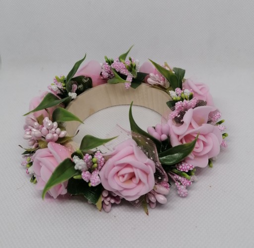 - wykorzystano piankowe róże o średnicy 30 -35mm, dekoracyjny ryżyk, delikatne kawałki tiulu, atłasową wstążkę