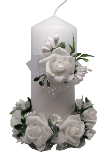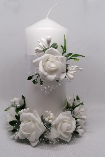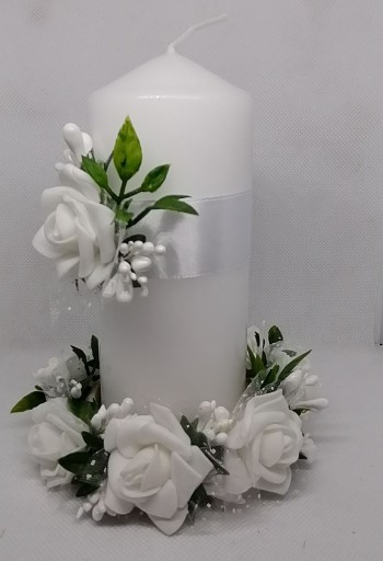 - górna dekoracja świecy umocowana na atłasowej wstążce