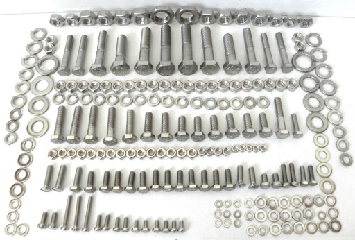 Komplet złożony jest z chromoniklowych elementów nierdzewnych wykonanych w klasie A2. W skład kompletu wchodzą śruby, wkręty, nakrętki i podkładki podzielone na 17 osobno spakowanych grup, umożliwiających bezproblemowy montaż poszczególnych elementów motocykla.