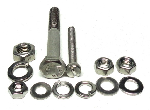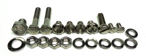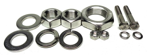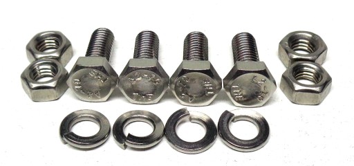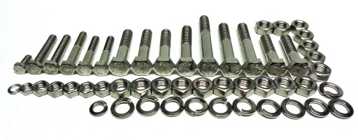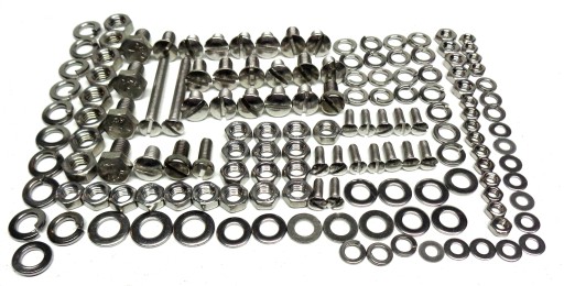 Komplet złożony jest z chromoniklowych elementów nierdzewnych wykonanych w klasie A2. W skład kompletu wchodzą śruby, wkręty, nakrętki i podkładki podzielone na 10 osobno spakowanych grup, umożliwiających bezproblemowy montaż poszczególnych elementów motocykla. Do grupy "Podnóżki i pedał hamulca" zostały dołożone 2 nakrętki koronkowe drobnozwojne, stalowe w powłoce ocynku w klasie 8.