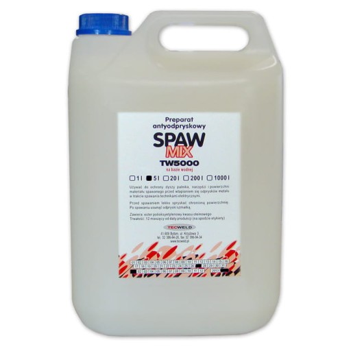 Preparat Spawmix TW-5000 to preparat antyodpryskowy do zabezpieczania elementów palnika przed odpryskami podczas spawania elektrycznego oraz do zabezpieczania powierzchni. Pojemność: 5 l, producent: TECWELD