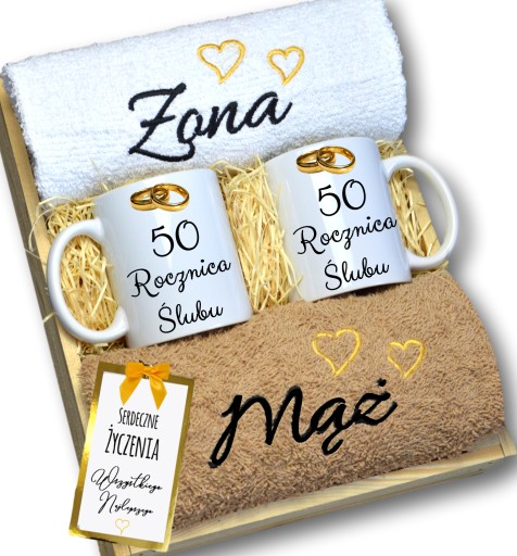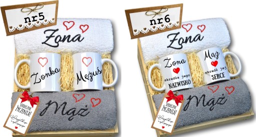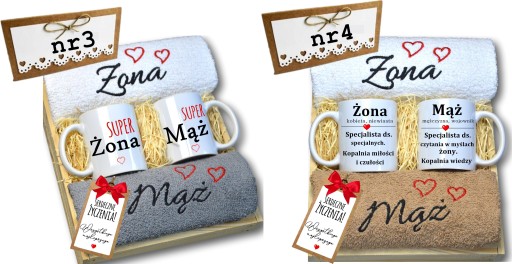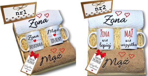 Ręczniki z kubkami DREWNIANEJ SKRZYNCE z haftem Żona - Mąż na ręcznikach oraz napisami na kubkach