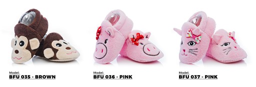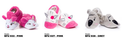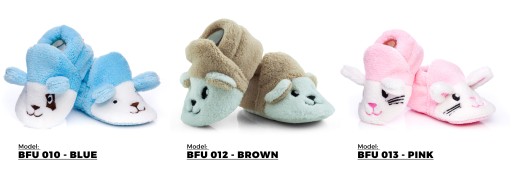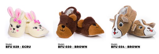 Ciepłe, domowe buciki niemowlęce wykonane w całości z dzianiny przypominającej futerko. Buciki przypominają zwierzaki dzięki dodatkowym haftom i doszywanym elementom. Podeszwa nakrapiana systemem antypoślizgowym. Idealne na wózek i do łóżeczka.
