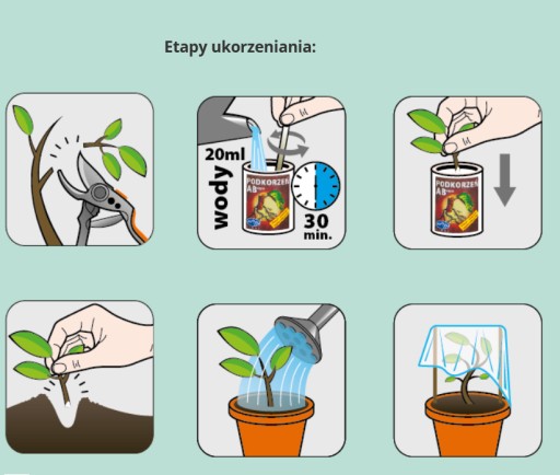 Obcięte boczne pędy (gałązki) zanurza się w odpowiednim podkorzeniu na 0,5-2cm i sadzi do wcześniej przygotowanych dołków. Natomiast przy pikowaniu sadzonek już ukorzenionych zanurza się lub obsypuje korzenie. Średnio opakowanie 20g wystarcza na 500 sztuk kilkucentymetrowych sadzonek.