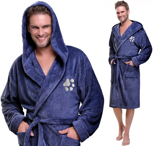 Szlafrok męski z kapturem, wiązany w pasie, z miękkiej dzianiny (soft), na biodrach kieszenie zewnętrzne, na wysokości klatki piersiowej haft - ŁAPKA. Miły i przyjemny w dotyku, gwarantuje komfort noszenia.