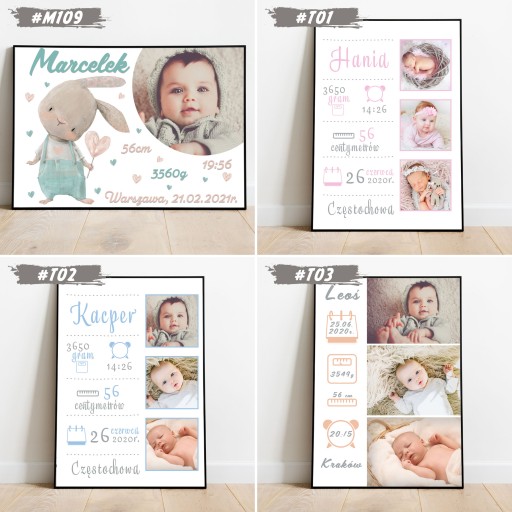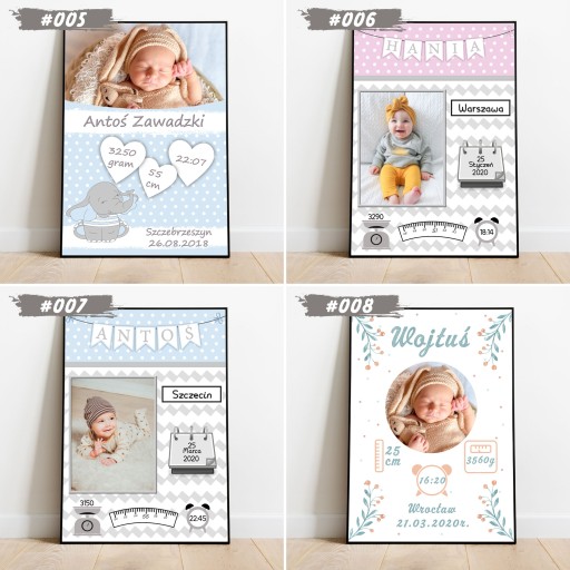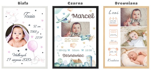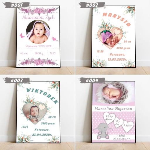 Zapraszamy do wyboru imiennej foto-metryczki w formacie A4 (21x29,7cm) w ramce do wyboru (ramki z ochronna plexi, zabezpieczone folią z możliwością postawienia - biała, czarna jak i powieszenia - biała, czarna, drewniana). Plakat drukowany jest na profesjonalnym papierze fotograficznym oraz oprawiony od razu w ramkę. Informację zawarte na wzorach są przykładowe i można je dowolnie modyfikować - usługa jest bezpłatna!