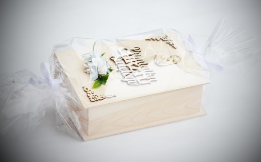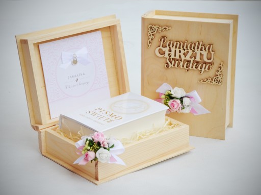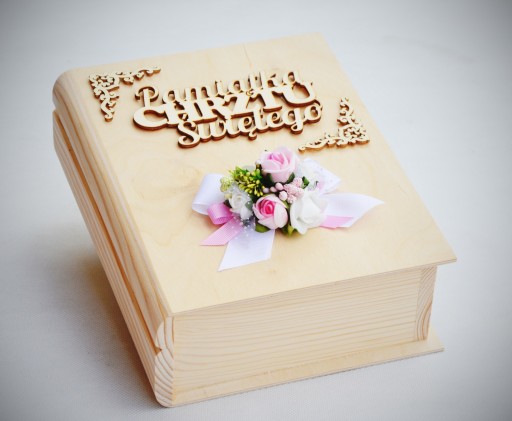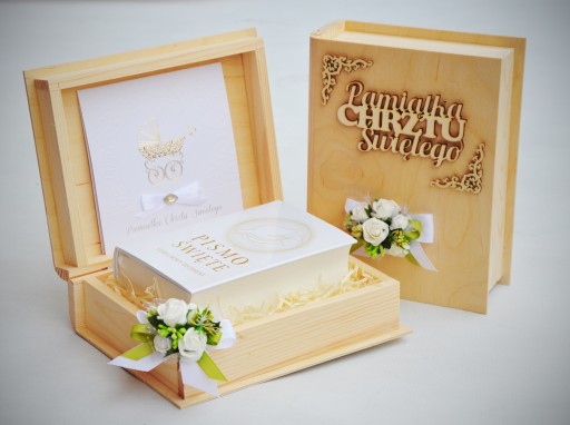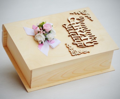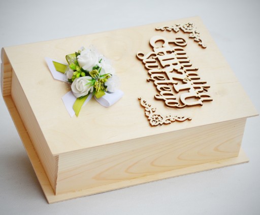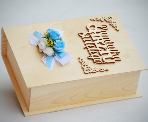 - elegancką, drewnianą szkatułkę w kształcie książki z indywidualną, ręcznie wykonaną dekoracją; wymiar szkatułki 24x19x10cm
