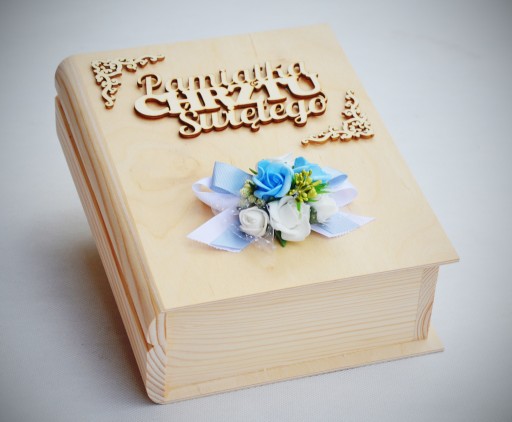 Dekoracja w kolorystyce delikatnego błękitu z białymi i zielonymi dodatkami. W zestawie błękitna Pamiątka Chrztu Świętej, która dopełnia piękny wygląd szkatułki, która może posłużyć, jako schowek na biblię, książeczkę świętą, różaniec.