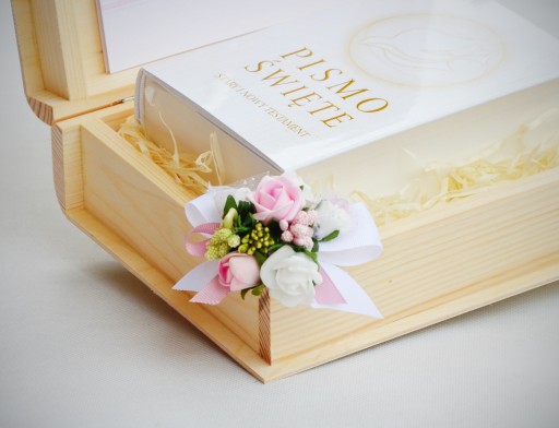 Dekoracja w kolorystyce delikatnego róży z białymi i zielonymi dodatkami. Całość wykonana ze sztucznych zielonych gałązek oraz delikatych kwiatków z gąbki. Szkatułka stanowi subtelny prezent dla małej dziewczynki. Drewniana szkatułka będzie piękną pamiątką na całe życie.