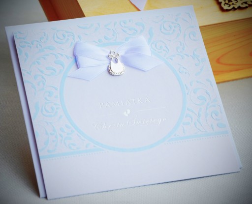 - Pamiątkę Chrztu Świętego wraz z kopertą w kolorystyce do wyboru: białej, różowej i błękitnej z elegancko wydrukowanymi życzeniami,