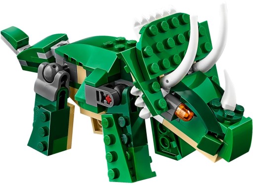 Ten zestaw da Ci mnóstwo świetnej zabawy! Znajdziesz w nim T-Rexa z ruchomymi łapami i głową, wielkimi szponami oraz otwierającą się paszczą uzbrojoną w spiczaste zęby. Dinozaur jest koloru ciemnej zieleni i beżu i ma jasnopomarańczowe oczy. W zestawie znajdziesz też resztki ofiary dinozaura w postaci klatki piersiowej do złożenia. LEGO® Creator Potężne dinozaury to zestaw typu „3 w 1”: model można przerobić na triceratopsa lub pterodaktyla.