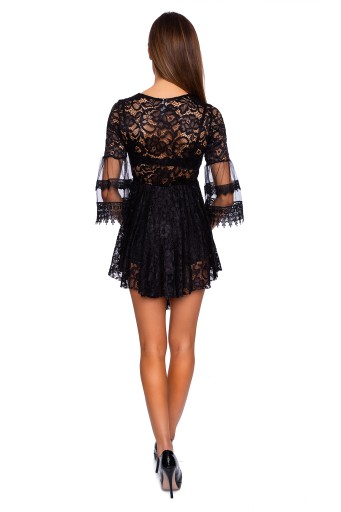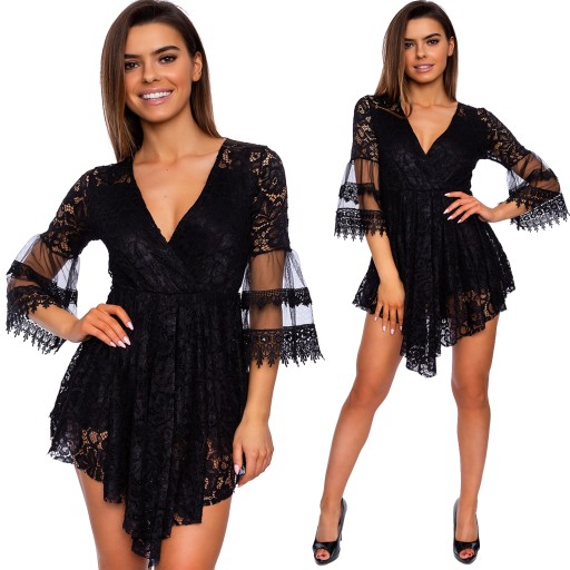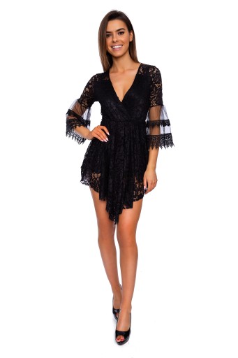 Kombinezon koronkowy boho asymetryczny . Wyjątkowy, wykonany z pięknej koronki kombinezon w stylu boho z długim, tiulowym, rozszerzanym rękawem ozdobionym gipiurą. Fason posiada gumę w talii, która dopasowuje go do sylwetki. Kopertowy dekolt podkreśli i wyeksponuje biust oraz szyję. Oryginalny krój a'la sukienka sprawia, że model będzie idealny na wszelkiego rodzaju uroczystości.