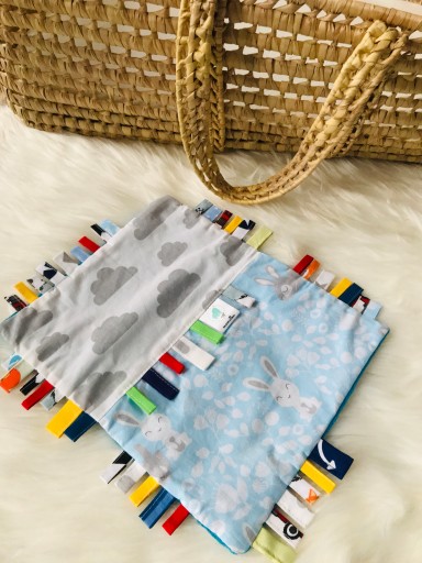 Szmatka z jednej strony jest bawełniana z drugiej strony jest polar minky z wypustkami, które są przyjemne w dotyku i pobudzają sensorykę.