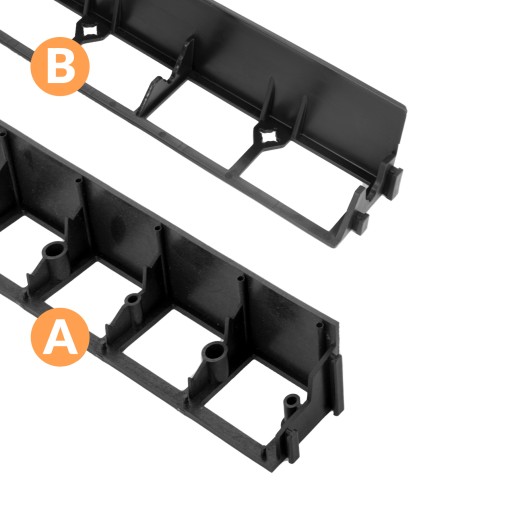 - Na górze (B) znajduje się tanie obrzeże (różnie nazywane na Allegro, np: Eko, Border, Ekoborder) które można zakupić na 95% aukcji dostępnych na Allegro. Jego ścianka jest zdecydowanie cieńsza, zaczepy pękają.