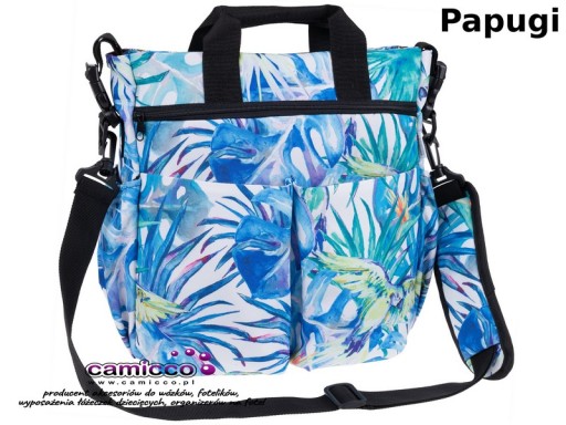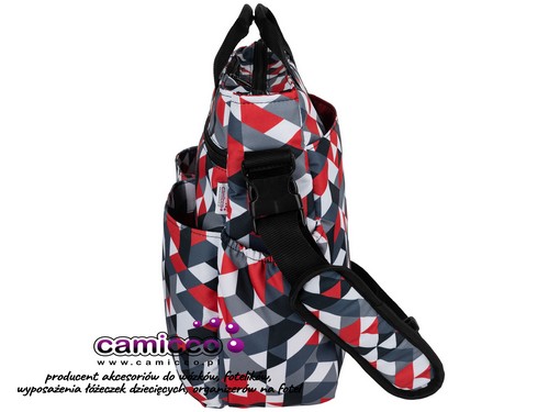 Torbę można nosić na ramieniu (posiada długi regulowany pasek) lub w ręku dzięki krótkim rączkom bądź powiesić na wózku dzięki specjalnym zaczepom przy torbie