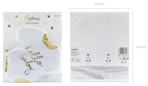 Cena obejmuje : 20 papierowych serwetek w kształcie dziecięcych body z napisem „Hello Baby” o wielkości ok. 16x16 cm.
