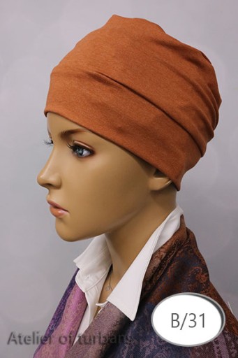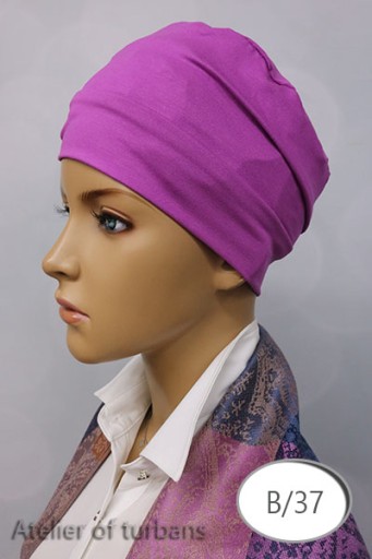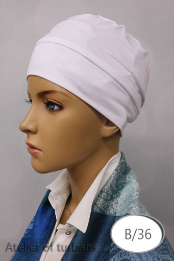 Turban uszyty metodą bezszwową (wszystkie szwy ukryte w środku), sprawia to że nie podrażnia on skóry głowy.