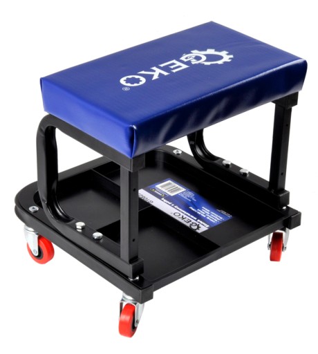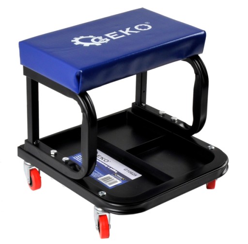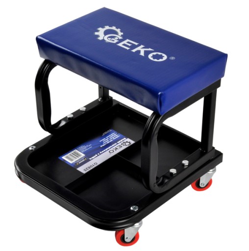 Stołek warsztatowy o stalowej konstrukcji, ponadto posiada cztery obrotowe kółka o 360 stopni, całkowicie wyściełane siedzisko i dzieloną półkę na narzędzia.
